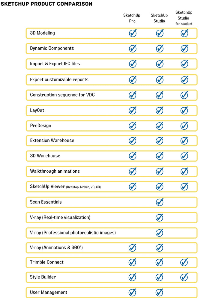 SketchUp Pro includes individual use of: SketchUp desktop, LayOut, Style Builder, SketchUp Viewer for XR apps, SketchUp Viewer for Mobile apps, SketchUp web, Pro support, Pro learning and Trimble Connect for Business.